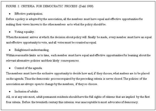 + | [[Image:Democraticprocess.JPG|thumbnail|630px|center|Figure I: Criteria for Demoractic Process]] |
