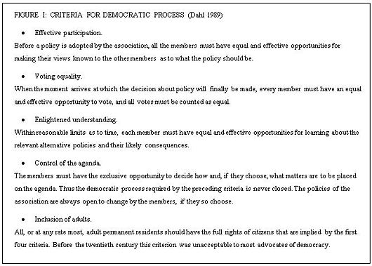 [[Image:Democraticprocess.JPG|thumbnail|530px|center|Figure I: Criteria for Demoractic Process]]